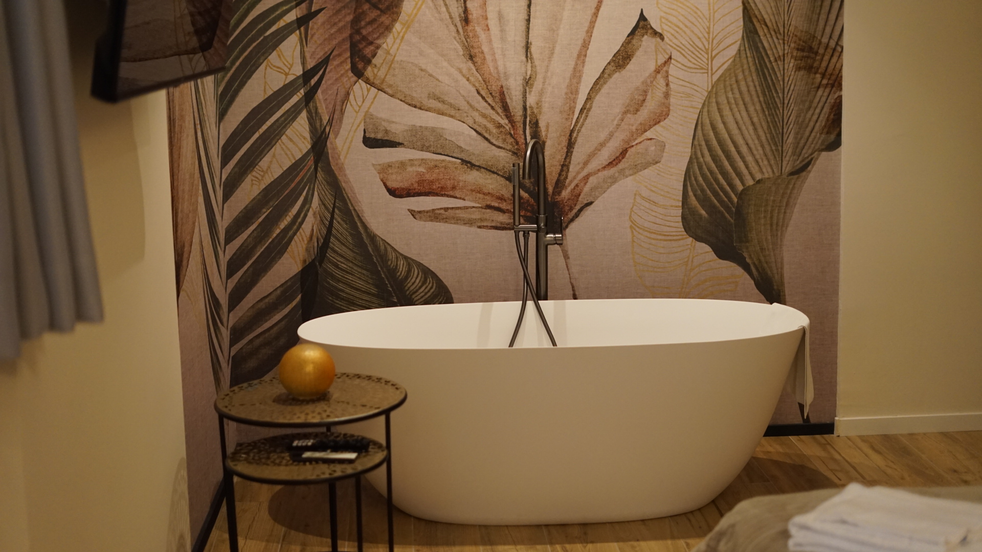 Spaziosa camera angolo cabina armadio, e poi la sorpresa, una meravigliosa Vasca direttamente in camera, abbracciata da una parete di foglie.