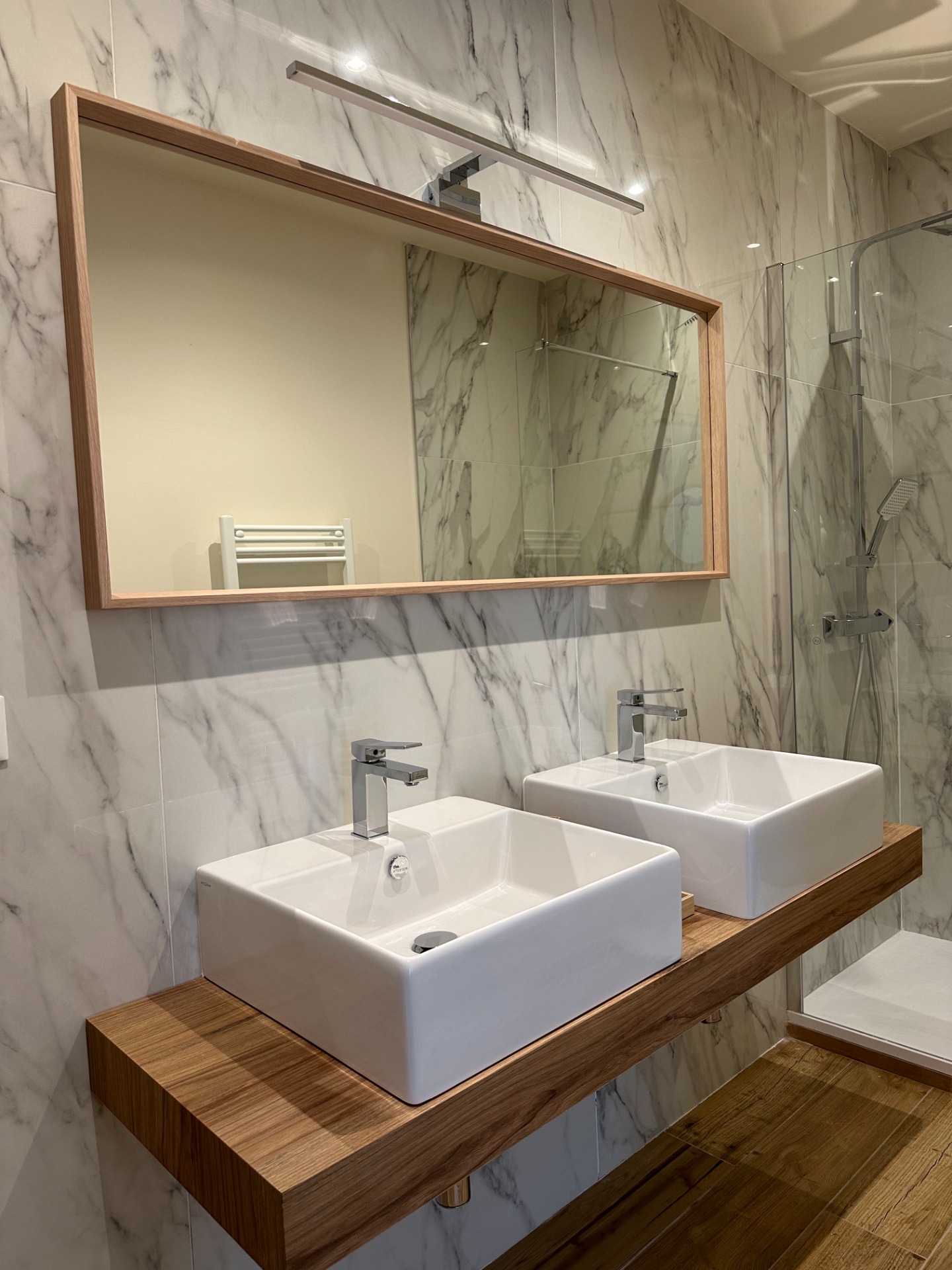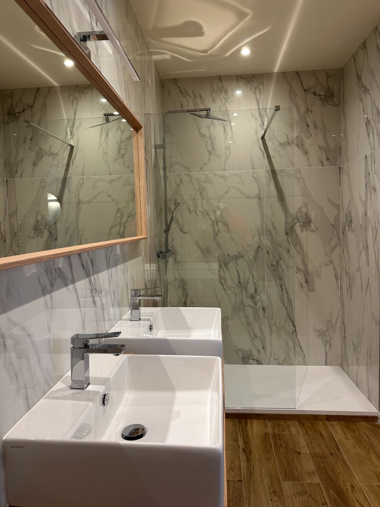 Varcando la porta a scrigno il meraviglioso bagno con rivestimento in marmo di Carrara, doppio lavabo, e ampia doccia.