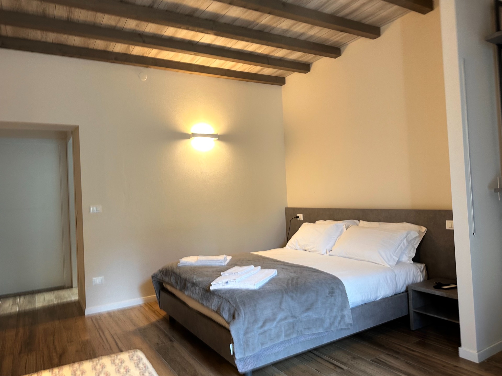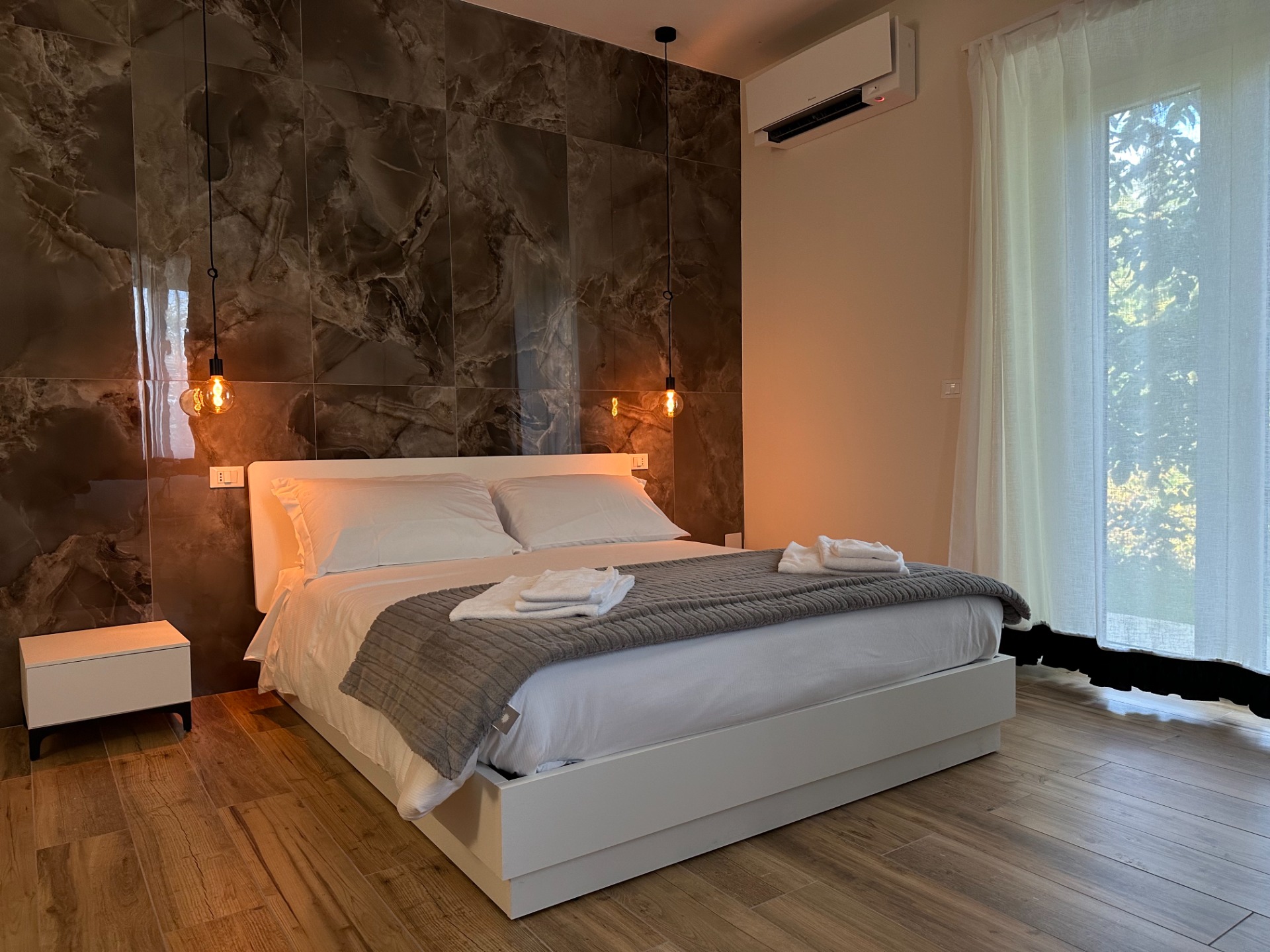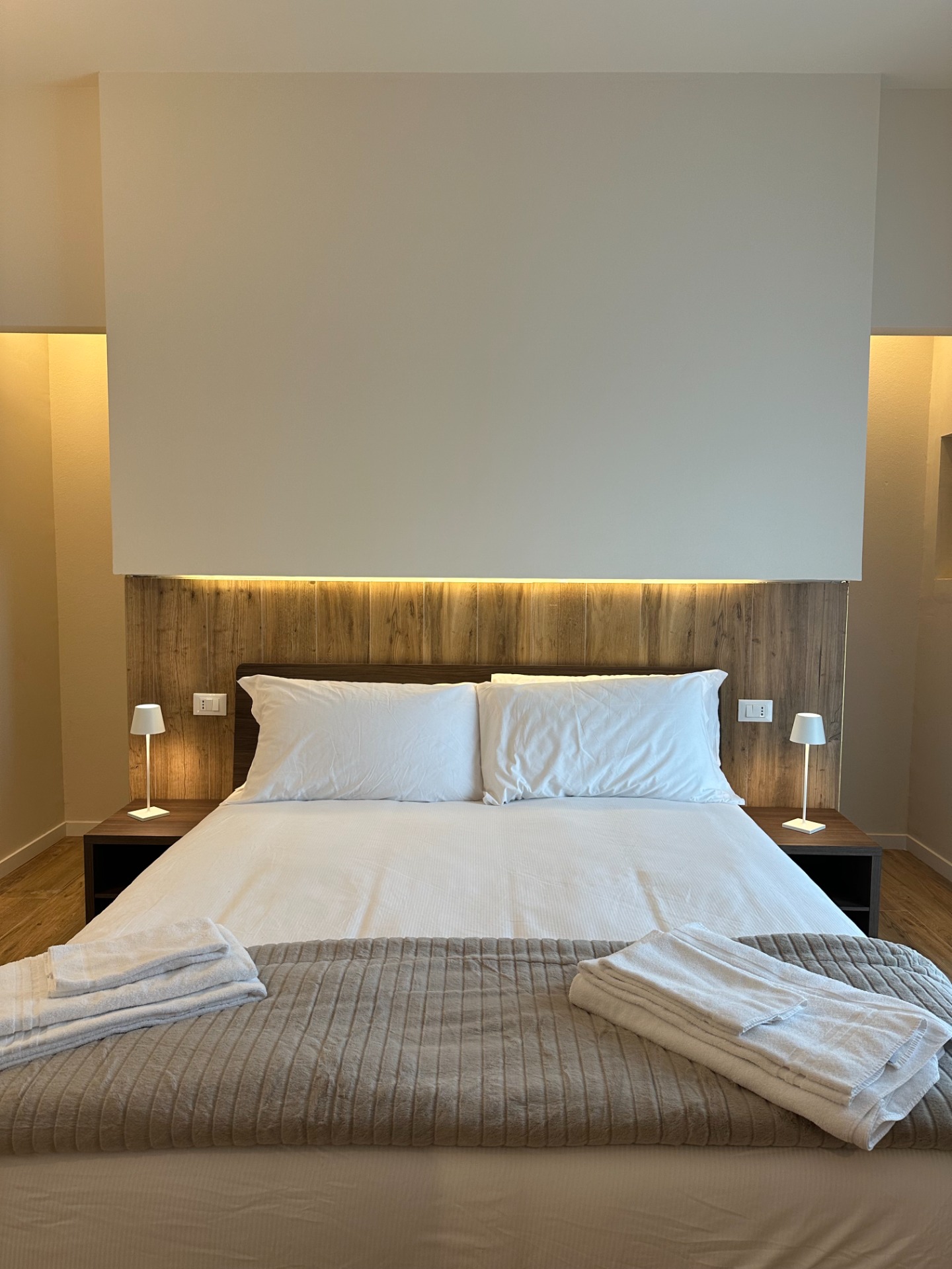 Spaziosa camera con letto matrimoniale,la cui testata è rivestita in legno delicatamente illuminato da un led.